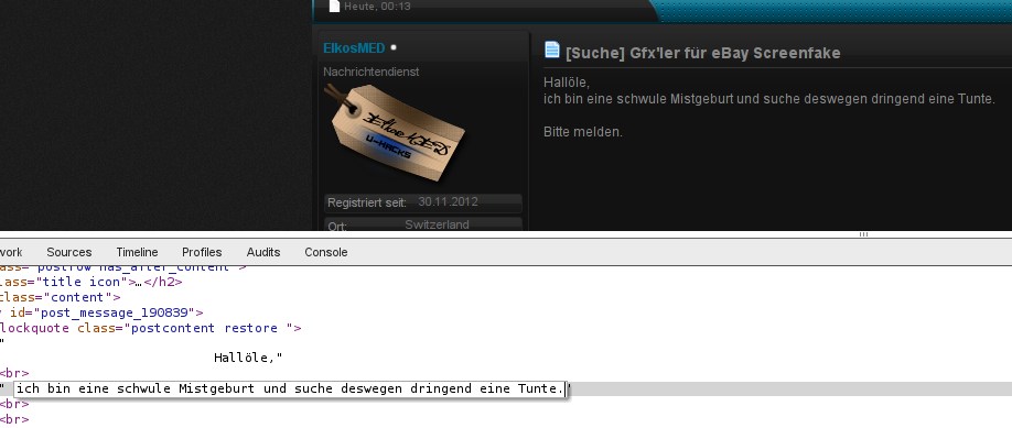 Bei Google Chrome: Klickst du mit deiner Maus Rechtsklick auf die Nachricht von Ebay und dann auf "Element untersuchen"(engl. Inspect Element). Unten müsste sich dann die Console öffnen mit der Nachricht. Dort wiederrum auf die Nachricht mit Rechtsklick klicken und "Edit as Text" bzw. "Edit as HTML" auswählen.