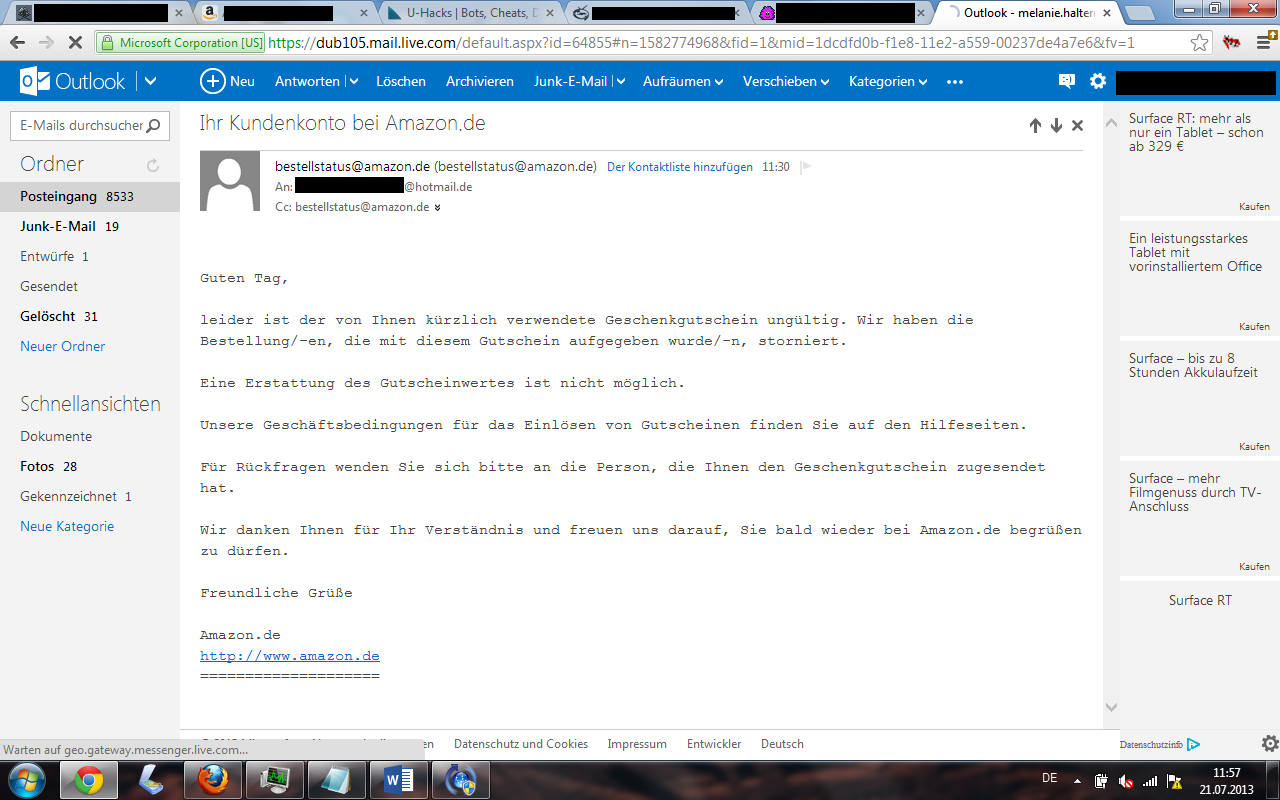 Heute bekam ich über das Amazon-System folgende Nachricht: