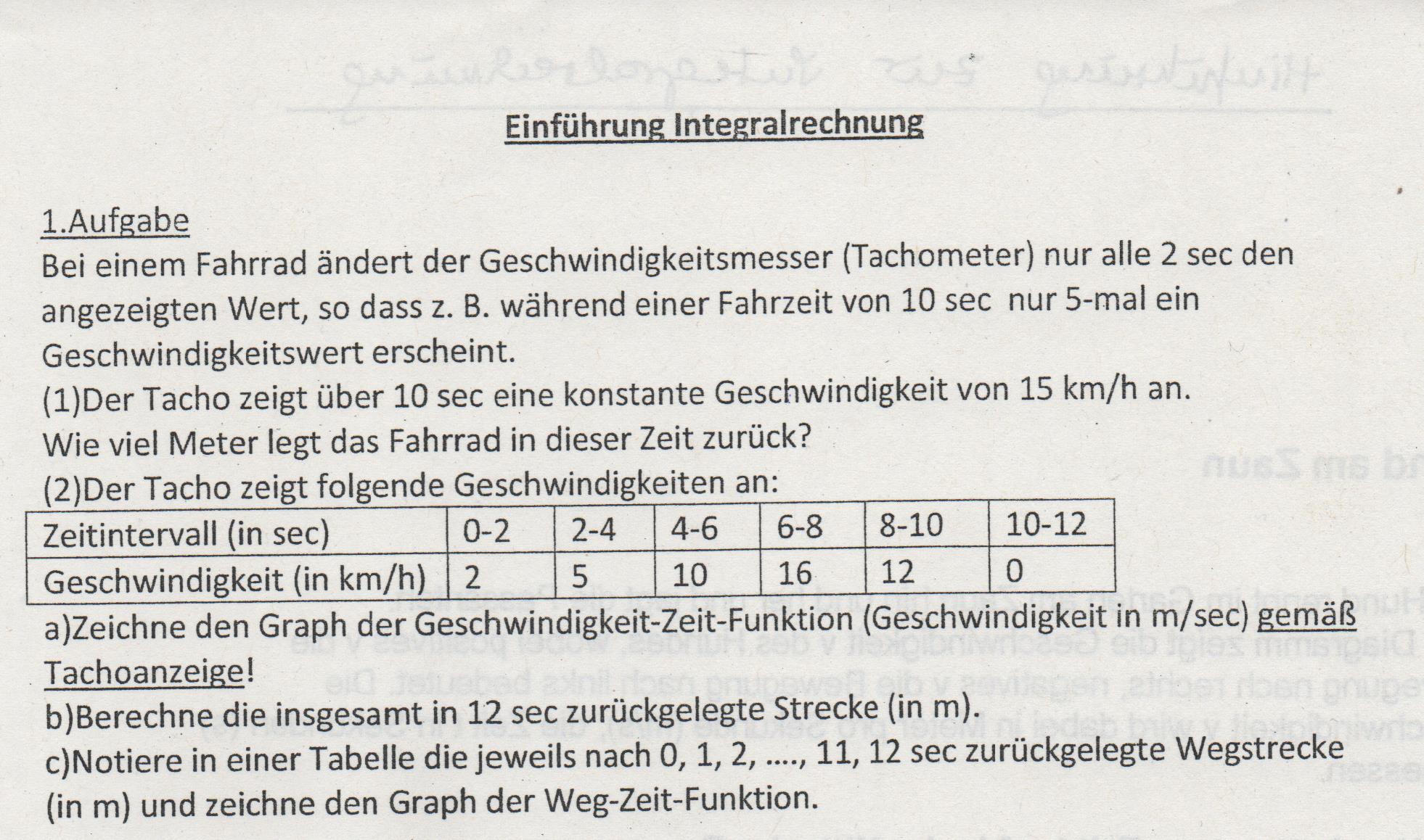 Für den Graph im Speziellen interessieren wir uns aber nicht, sondern um die Fläche, die der Graph zusammen mit der X-Achse einschließt. Können wir selbige berechnen, sind wir in der Lage, die Strecke in Metern anzugeben, die während der 12 Sekunden zurückgelegt wurde. Und zwar genauer, als es in Teilaufgabe 1 möglich war, denn auf dem Fahrrad hält man seine Geschwindigkeit nicht konstant.