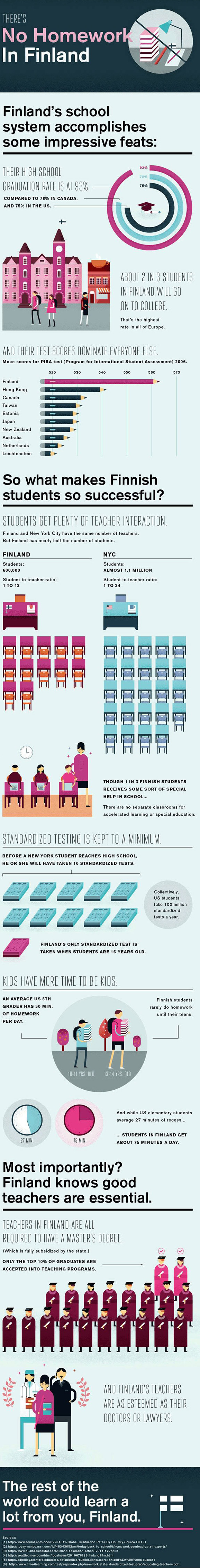 Es sind zwar die USA, bei denen das Schulsystem etwas anders ist wie hier. Aber die in der Grafik verglichenen Aspekte sind in Deutschland zumindest ähnlich oder sogar gleich. Beispielsweise die Klassengröße. Da würde ich sogar sagen, dass die Klassen hier öfter größer sind als 24 Schüler wie in den USA. Meine Schulzeit ist noch nicht lange her und ich war immer in Klassen mit um die 30 Schülern. Ein Einzelfall war das auch nicht, da die Parallelklassen auch so groß waren. Außerdem haben die USA in den Pisa-Tests ähnlich schlecht abgeschnitten wie Deutschland, wogegen Finnland regelmäßig am besten abschneidet und fast immer unter den ersten 3 ist.