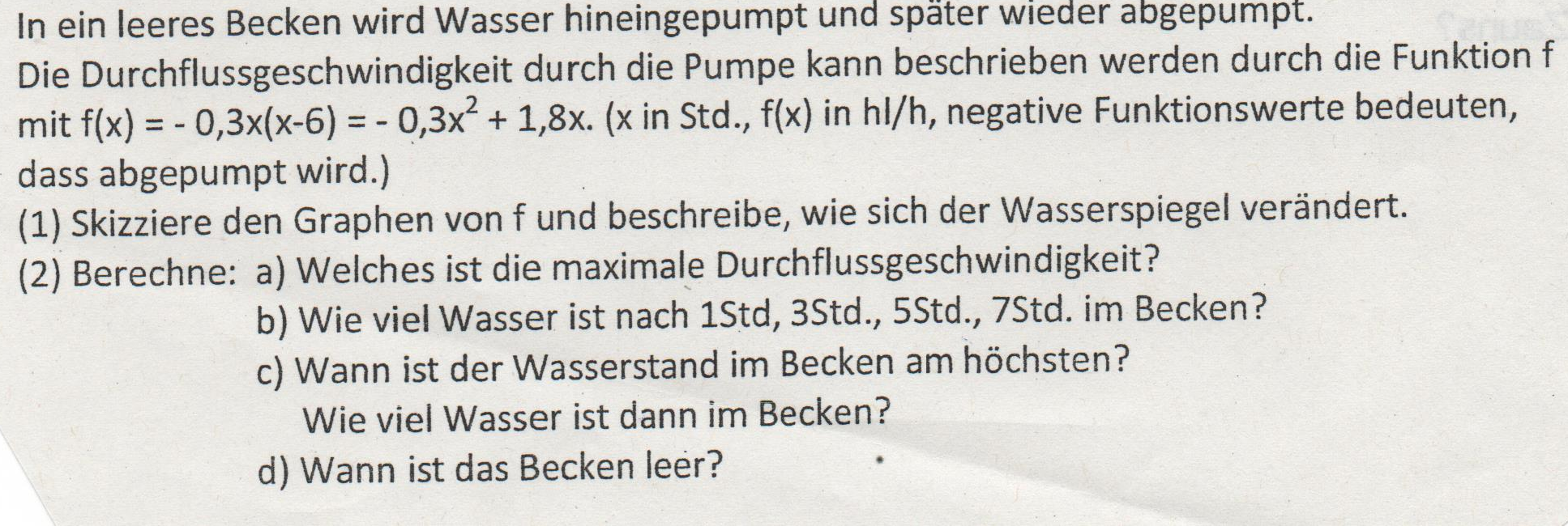 - Wann ist der Wasserstand im Becken am höchsten? Das ist der x-Wert des (globalen) Hochpunktes, den du bei a) errechnet hast.