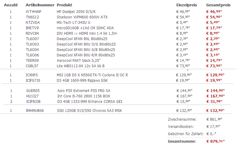 Produktliste (sind noch andere Sachen wie Drucker/Lüfter/Speicherkarte etc. bei)