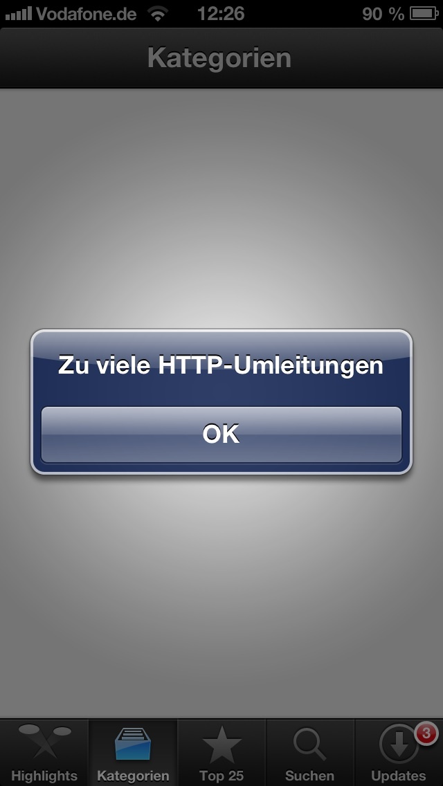 Seit vorgestern funktioniert mein AppStore irgendwie nicht mehr. Ich habe kein Update gemacht, nichts wiederhergestellt oder Sonstiges - ich wollte den AppStore öffnen, und da erschien der Fehler. Das Komische ist, dass es nur bei den Unterkategorien "Kategorien" und "Top 25" nicht funktioniert.