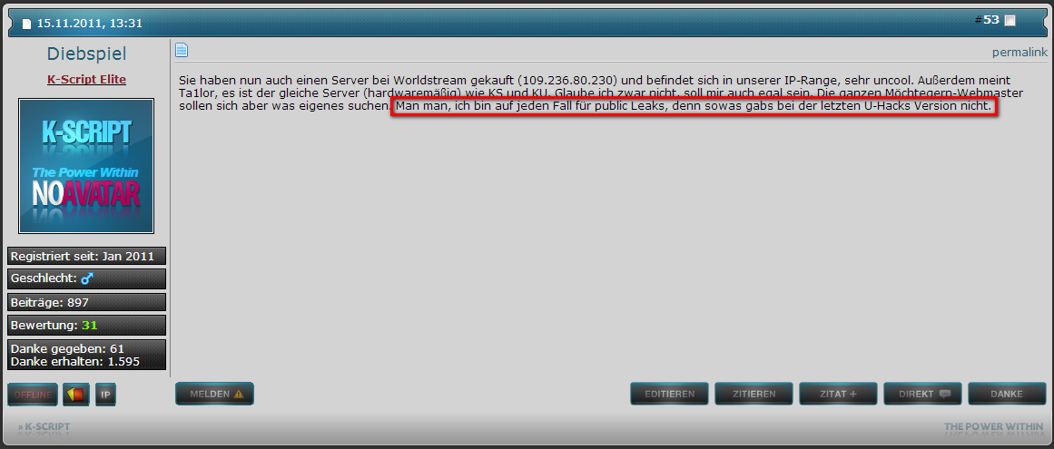 Das Backup kommt von Momo, eurem netten Ex-Admin. Der hat mit dem Betrug um die 40k Knuddels ja schon mehr als genug bewiesen, wie relevant KS für ihn ist. Das er alles was er von KS besitzt inklusive dem kompletten Dump und damit auch sämtliche Userdaten für ein paar Euro verkauft unterstreicht das nur noch. Außerdem sind ganz zufällig die bei euch im Forum angekündigten Dinge auch bei uns passiert.
