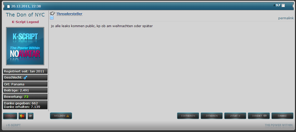 Für mich hat sich die Sache mit dem Ende von KS eh erledigt und ich bin froh, dass wir nicht wie früher regelmäßig Zeit für so sinnlose Aktionen wie die Suche nach angeblichen Leakern oder ähnliches verschwenden müssen. Ich finde nur, dass sowohl unsere Nutzer als auch die ehemaligen KS-User wissen sollten, was damals wirklich passiert ist. Verstehe ich sowieso bis heute nicht, dass zwei Foren mit dem gleichen Thema deren Userzahlen bereits damals gesunken sind nix besseres zutun haben als sich gegenseitig ans Bein zu pinkeln. Aber gut, das war nun mal so.