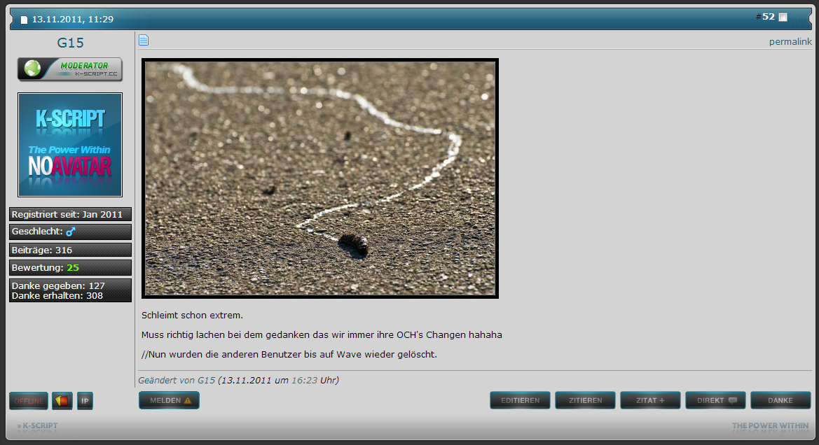 Auffällig ist, dass Diebpsiel da nicht nur passiv dabei ist wie ich früher dachte, sondern SEHR aktiv mitgewirkt hat. Finde ich ziemlich schade, da er zu der Zeit den Eindruck machte als wäre er einer der wenigen in KS-Team die noch halbwegs klar im Kopf sind und solchen Unsinn nicht mitmachen. Aber wie man sieht ist dem ganz und gar nicht so.