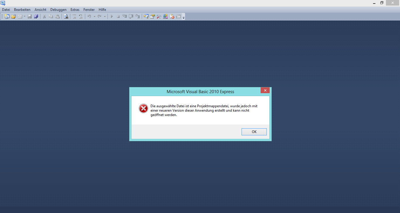 2012 ist schon seit über einem halben Jahr draußen, du nutzt noch 2010. Wurde mit Visual Studio 2012 erstellt. Die Express-Edition der aktuellen 2012er kannst du hier runterladen: Visual Studio Express 2012-Produkte | Microsoft Visual Studio#