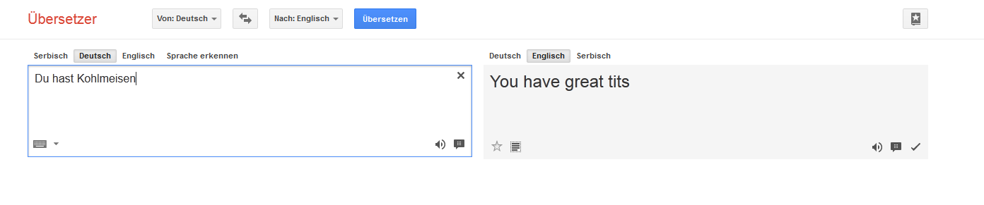 da ich ab und an den Google Übersetzer für schulische Zwecke benutze und öfter mal Unsinn bei rauskommt, eröffne ich mal einen Sammelthread. Bin ja sicher nicht der einzige der sich bei manchen Übersetzungen von Google die Glaubensfrage stellt :b