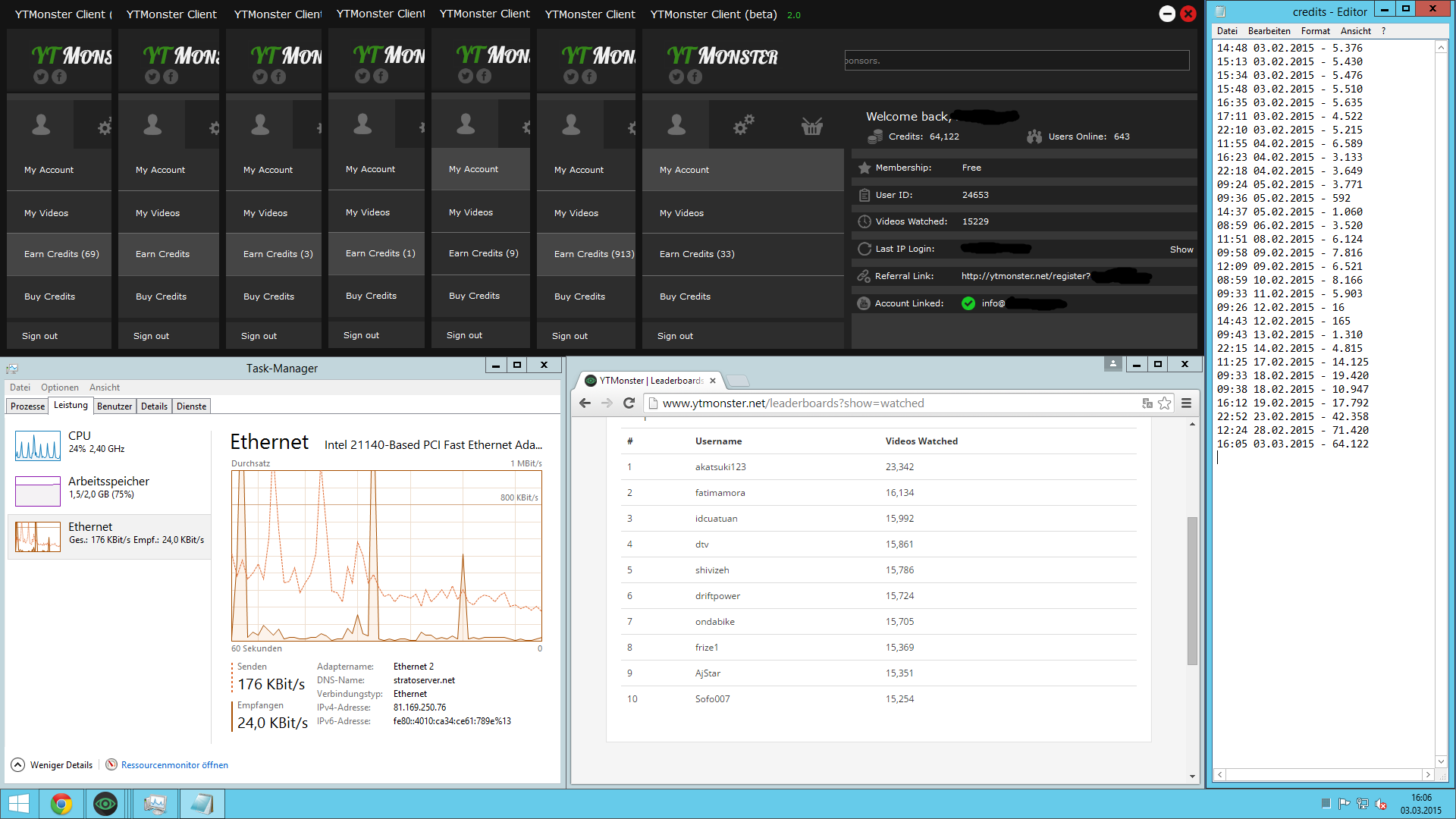 Hab's nicht nötig aber du musst das Ganze mal so sehen: 1.000 Credits kosten 1$. Also verkaufe ich Accounts mit ~100.000 Credits für 50-60$. Habe ich schon ein paar Mal gemacht und da hat man schnell die 9€ für den Windows-VPS drin und alles was darüber liegt geht an mich, ohne dafür irgendwas zu tun