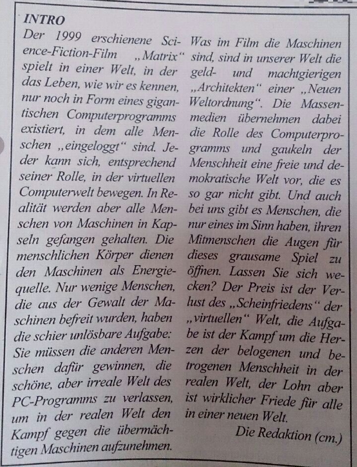Der abgebildete Artikel ist Geschwurbel, der eigentliche Inhalt des Films "Matrix" wurde offensichtlich nicht verstanden, und ansonsten scheinen mir das Verschwörungstheorien zu sein, daß geheime Mächte eine "Neue Weltordnung" planen. Selbst wenn es so wäre, verstehe ich nicht den Sinn dahinter, das mit Matrix zu vergleichen, weil der Vergleich einfach nur sehr sehr weit hergeholt wäre. Natürlich kann man auch Flugzeuge mit Bienen vergleichen, weil beide irgendwie fliegen, aber wozu sollen solche Vergleiche gut sein?