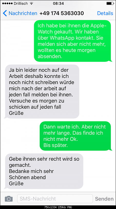 Herr T.: Sie ich Arbeite sie drohen mir hier ich konnte erst jetzt schreiben muss leider bis Samstag noch in Köln arbeiten da ich Gleisbau arbeite.Sie drohen mir mit einer anzeige sie ich bin kein betrüger wenn sie ihr geld zurückwollen überweise ich es heute noch bin nicht so ein mensch.Ich bin sonntag zurück wenn es ok ist würde ich es sobald ich da bin mit 30€ entschädigung den apple watch an sie schicken ansonsten können wir gerne den kauf beenden und ich überweise ihr geld zurück garkein themaIch bin nicht so ein mensch verdiene selber mein geld hart..Kann halt nicht immer schreiben bin gerade wach geworden fahren gleich zur arbeit tut mir leid muss halt 2bis 22 23 uhr arbeiten sry..