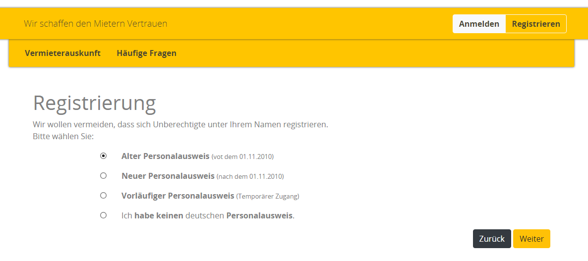 Damit das ganze nicht "missbraucht" werden kann, nutze ich zur legimitation der Nutzer die Personalausweisnummer. Hier wird das Geburtsdatum geprüft, geschaut, ob der Ausweis noch gültig ist und vor allem anhand der Prüfziffern auch gecheckt, ob die Personalausweisnummer "gültig" ist. Jeder Nutzer darf demnach nur einen Account besitzen.