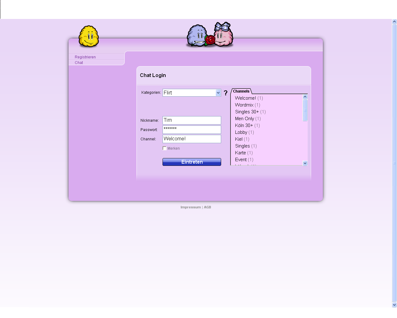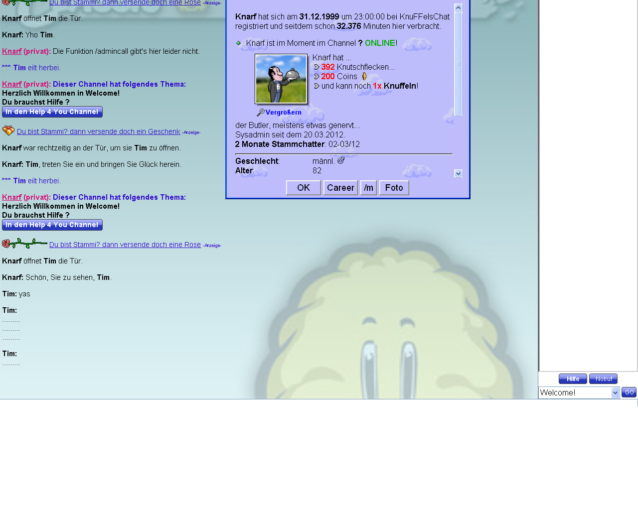 Ich würde Dir vorschlagen vielleicht eine andere Farbe einzusetzen für die Startseite - nicht das Rosa von Knuddels. Auch wenn es schöne Erinnerungen weckt - es ist dein Chat und am betsen individulisier Ihn nach deinen Wünschen - sowie mit den Coins etc.
