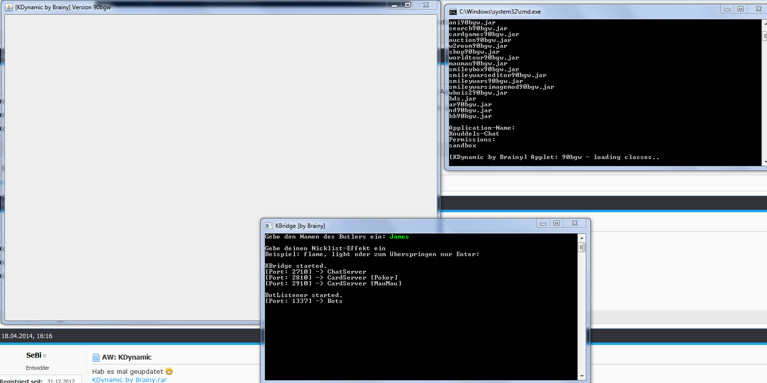 Leider habe ich die Source nicht mehr (Source ist nicht obfuscated, also leicht zu rekonstruieren), vielleicht setzt sich einer hin und manipuliert die Methode getAppletVersion (so ähnlich). Soweit ich mich aber erinnere, funktionierte es, wenn man KDynamic mehrmals gestartet hat, bis es dann ging…
