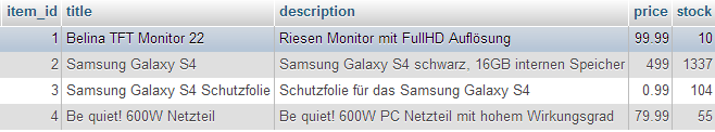 item_id title description price stock 1 Belina TFT Monitor 22" Riesen Monitor mit FullHD Auflösung 99,99 10 2 Samsung Galaxy S4 Samsung Galaxy S4 schwarz, 16GB internen Speicher 499 1337 3 Samsung Galaxy S4 Schutzfolie Schutzfolie für das Samsung Galaxy S4 0,99 104 4 Be quiet! 600W Netzteil Be quiet! 600W PC Netzteil mit hohem Wirkungsgrad 79,99 55