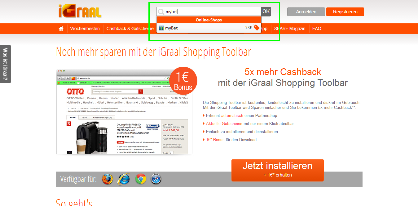 iGraal Anmeldung 5€, iGraal Toolbar 1€, myBet Anmeldung sowie Einzahlung 30€.