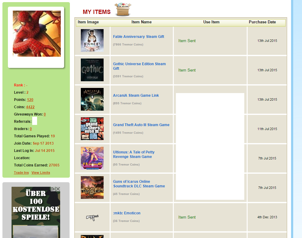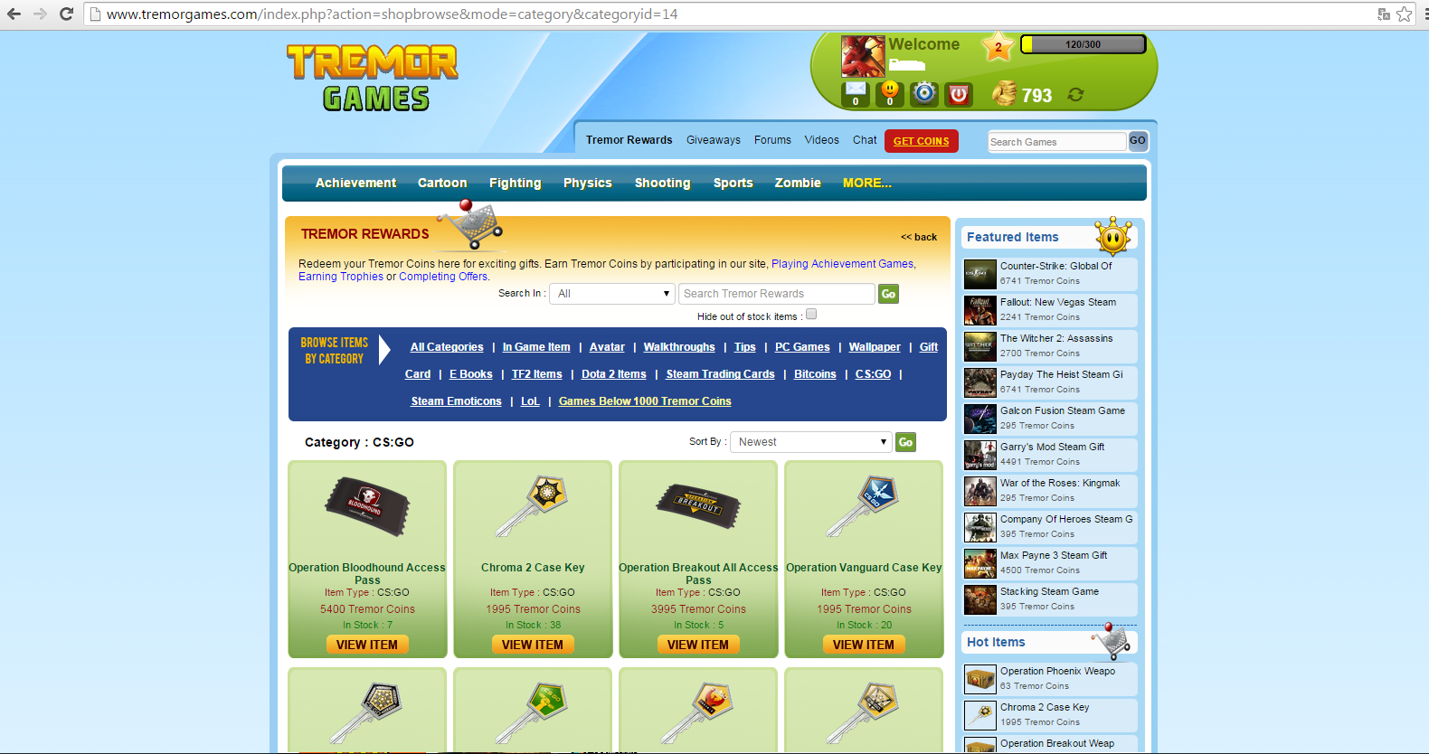 Wenn ihr nun genug Punkte habt, geht ihr auf Tremor Rewards und sucht euch eure Games, Items aus (wie auf mein Bild CS-Go Zeug)