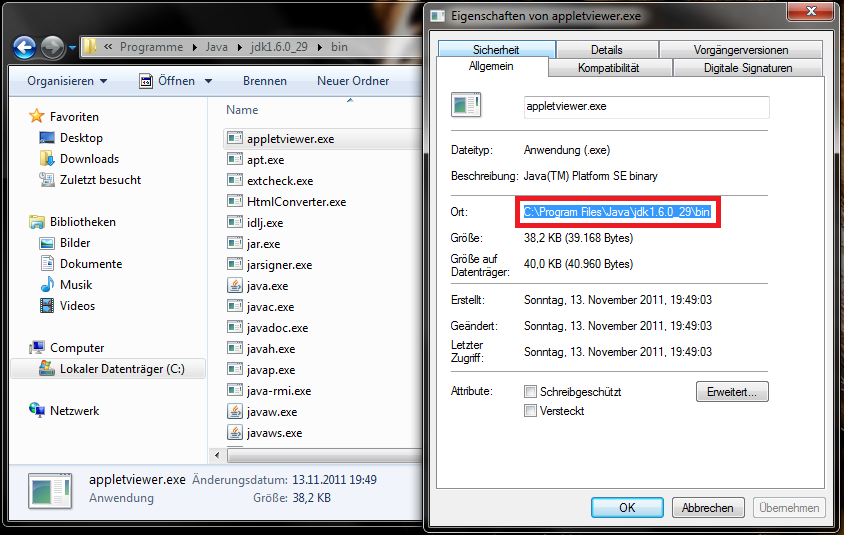 Nach der Installation, müssen wir den bei der Installation angegeben Installations-Pfad aufrufen. Wenn ihr JDK für 32-Bit runtergeladen habt, geht ihr in den Ordner Programme (x86) und bei JDK für 64-Bit, geht ihr in den Ordner Programme. Ich habe ein 64-Bit System und habe JDK für 64-Bit installiert, deshalb bin ich im Ordner Programme. Dort sucht ihr nach dem Java Ordner und öffnet diesen. Darin sollte sich dann ein Ordner mit dem Namen jdkVERSION befinden, welches ihr dann öffnet und daraufhin geht ihr in den Ordner bin, öffnet die Eigenschaften von einer beliebigen Datei darin und kopiert den Pfad bzw. Ort.