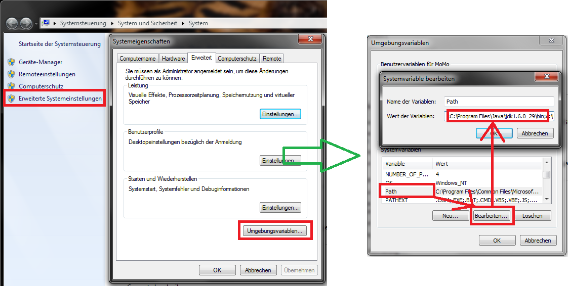 Fast fertig! Jetzt geht ihr auf die Eigenschaften vom Arbeitsplatz bzw. eurem Computer, öffnet die erweiterten Systemeinstellungen und klickt auf Umgebungsvariablen. Nun sollte sich ein weiteres Fenster geöffnet haben, wo ihr unten in der Liste die Variable Path sucht, markiert und auf bearbeiten geht. Zuletzt fügen wir den Pfad vom JDK Ordner, den wir vorhin kopiert haben ein und bestätigen es mit OK. Wenn ihr diesen Pfad mitten anderer Pfade hinzufügt, muss nach dem Pfad ein Semikolon (;),wie es bei mir der Fall war, folgen.