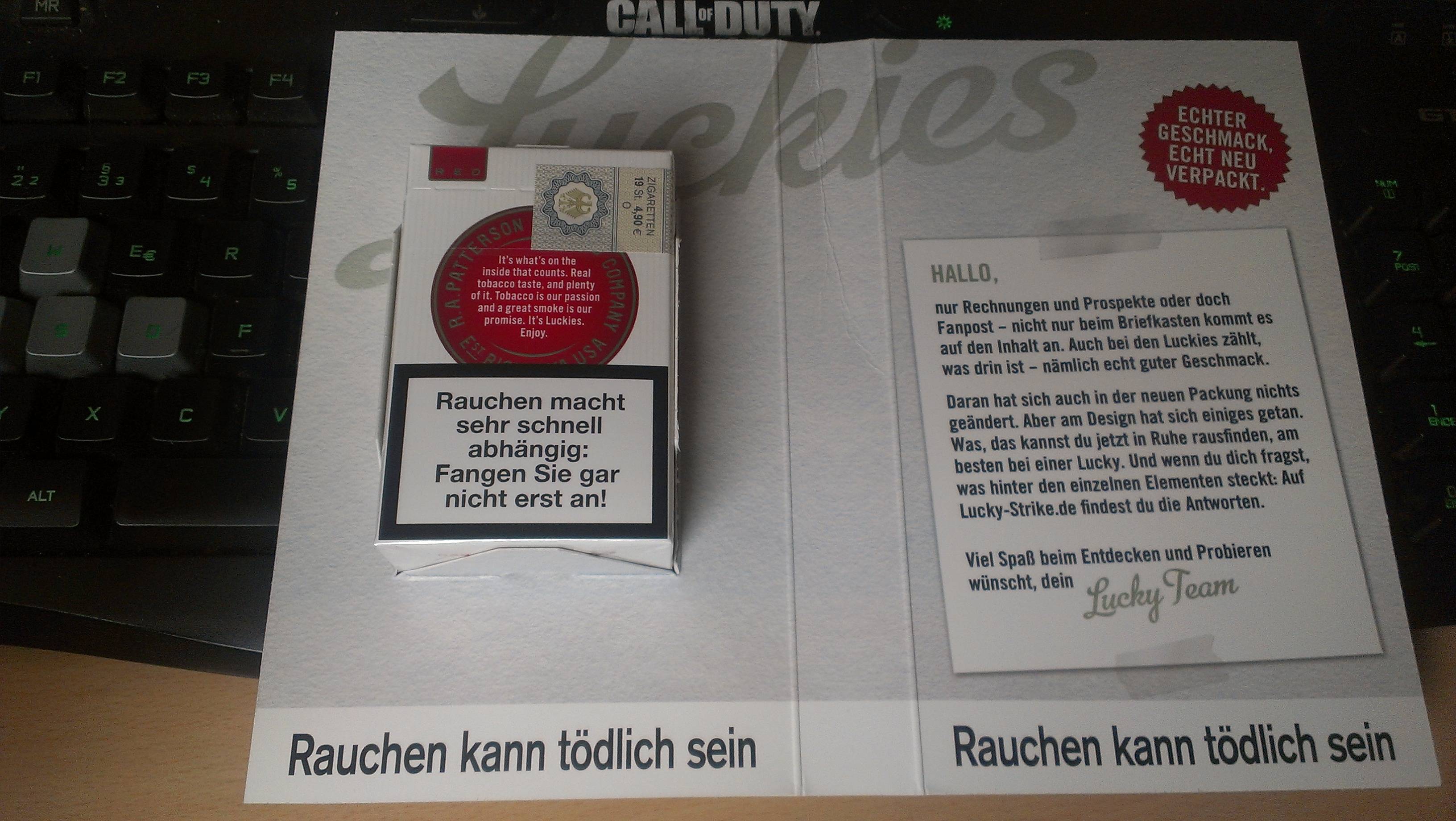 Bei mir kamen heute direkt 2x Luckystrikes (1x auf den Namen meiner Mutter und 1x auf meinen Namen) an & 1x eine Pallmall-Schachtel
