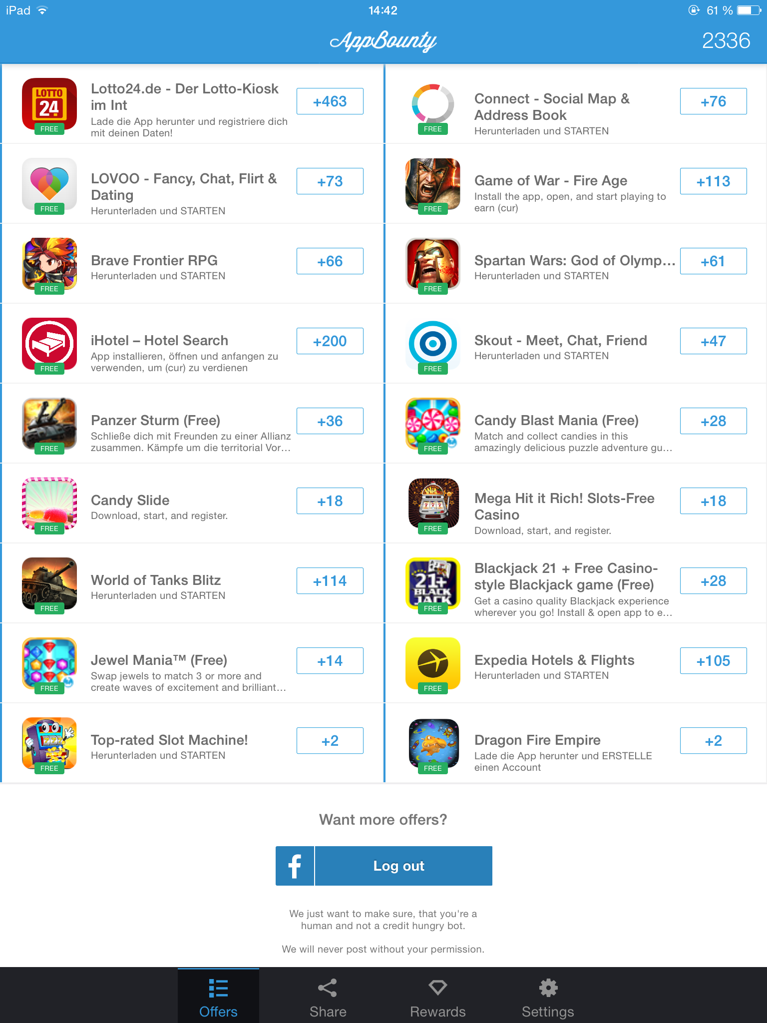 also so wirklich gut funktioniert das leider nicht, von drei versuchen klappt die gutschrift bei einer app, die richtig lukrativen werden komischerweise noch seltener gutgeschrieben. sehr ineffizent das ganze und es mangelt sehr schnell an angeboten besser mit >60 credits vergütung. also leider pure zeitverschwendung. ganzer vormittag rumgedödelei für einen lausigen 2euro gutschein bei amazon ^^ und am anfang hat man ja noch die angebote mit mehr credits, die sehr schnell verschwinden - für 10 euro bräuchte man eine woche oder so.
