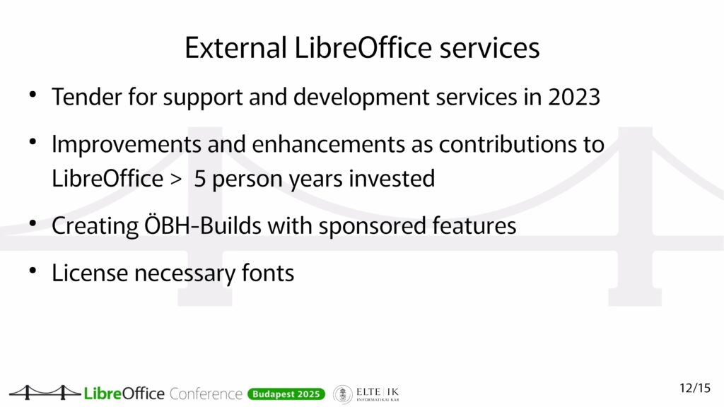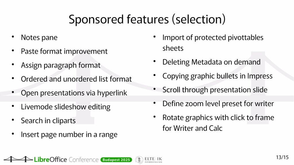 Eine zentrale Übersicht scheint es dazu in Österreich nicht zu geben. Doch dafür enthält die Präsentation auf Folie 13 Auszüge aus Sponsored features. Gemeint sind damit jene Funktionalitäten, die man selbst entwickelt oder erweitert hat. Statt sie nur intern zu verwenden, flossen sie in das LibreOffice-Projekt ein – können also von jedem genutzt werden.