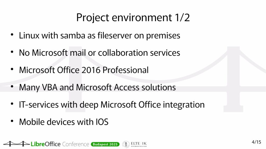 Beim Aufzeigen der Projektumgebung offenbart sich eine erste positive Überraschung: Dateien liegen auf Sama-Servern, die mit GNU/Linux betrieben werden. Mail-Dienste (Outlook/Exchange) und Software zur Zusammenarbeit (z.B. SharePoint) von Microsoft kommen nicht zum Einsatz. Lediglich Microsoft Office 2016 Professional, welches noch ohne Cloud auskommt. Exzessiv nutze man Access, außerdem einige VBA-Skripte – vermutlich in MS Excel. IT-Dienste sollen tief in MS Office integriert sein.