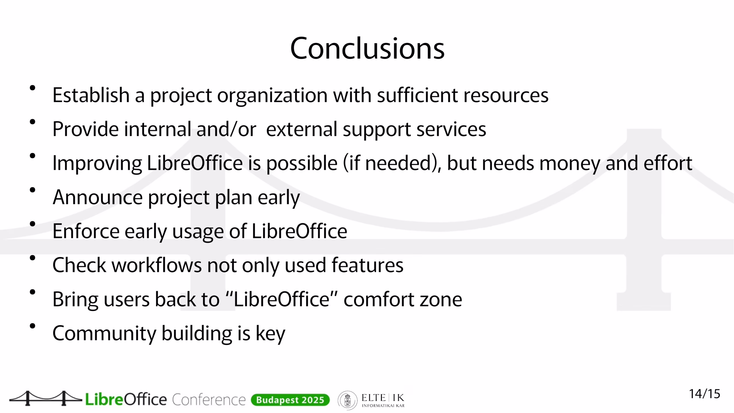 Mit einer Folie dazu schließt die Präsentation ab: Man benötigt ein Projektteam mit ausreichenden Ressourcen sowie Support-Dienste für die Anwender. Das mag offensichtlich klingen. Doch gerade wenn Geld sparen zum Ziel gehört, ist beides nicht unbedingt selbstverständlich. Verwand damit ist auch das Verbessern/Anpassen von LibreOffice. Prinzipiell bei OSS grundsätzlich möglich. Fällt allerdings nicht vom Himmel, sondern erzeugt entsprechenden Aufwand.