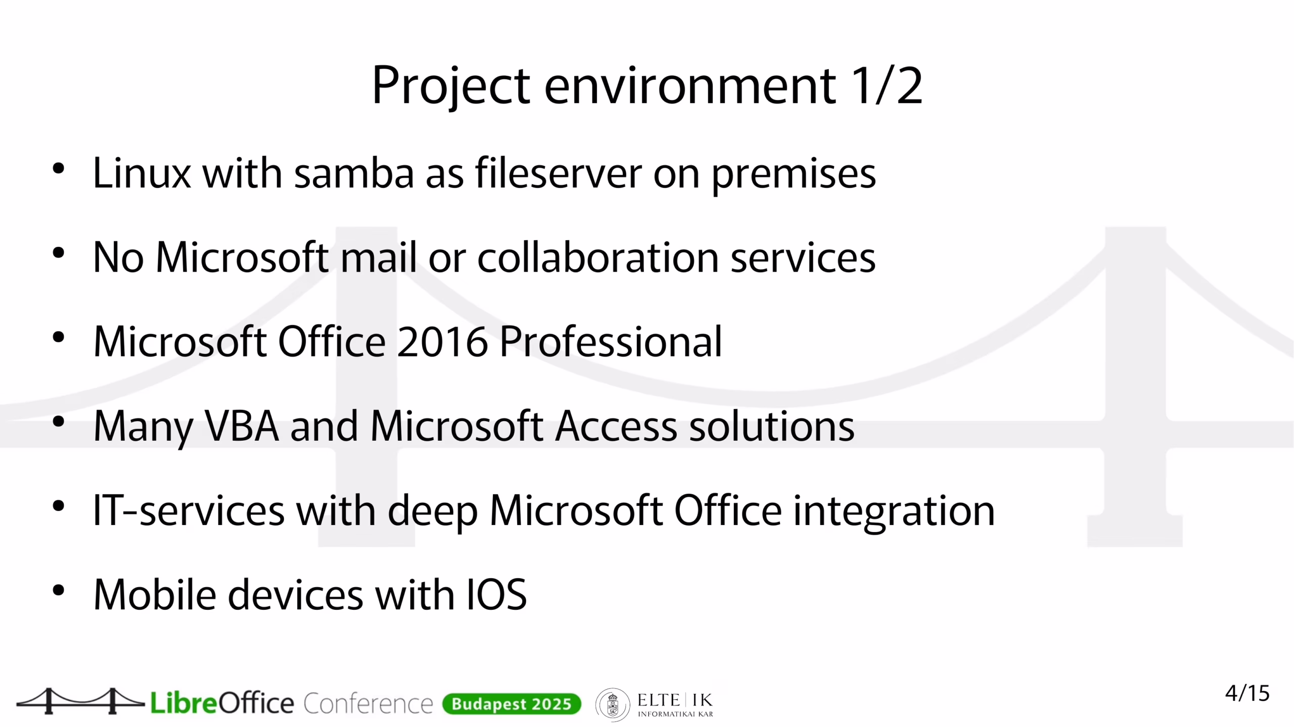Beim Aufzeigen der Projektumgebung offenbart sich eine erste positive Überraschung: Dateien liegen auf Sama-Servern, die mit GNU/Linux betrieben werden. Mail-Dienste (Outlook/Exchange) und Software zur Zusammenarbeit (z.B. SharePoint) von Microsoft kommen nicht zum Einsatz. Lediglich Microsoft Office 2016 Professional, welches noch ohne Cloud auskommt. Exzessiv nutze man Access, außerdem einige VBA-Skripte – vermutlich in MS Excel. IT-Dienste sollen tief in MS Office integriert sein.