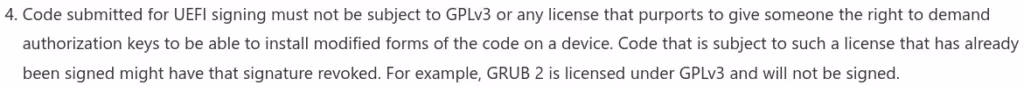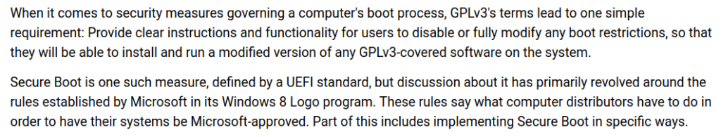 Da Secure Boot komplett in der Kontrolle des Konzerns liegt, kann er frei entscheiden, unter welchen Umständen sie andere Betriebssysteme darüber starten lassen. Selbst 12 Jahre später scheint dieses Quasi-Monopol selbst für staatliche Regulierungsorganisationen kein Problem darzustellen. So führt der Konzern 2022 die NX Kompatibilität als Voraussetzung ein. Freie Softwarelizenzen wie die GPLv3 akzeptiert er nicht. Insgesamt 18 Punkte müssen erfüllt sein, um überhaupt von MS in Erwägung gezogen zu werden. 1