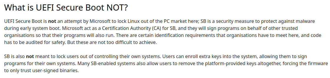- https://wiki.debian.org/SecureBoot#What_is_UEFI_Secure_Boot_NOT.3F ↩︎