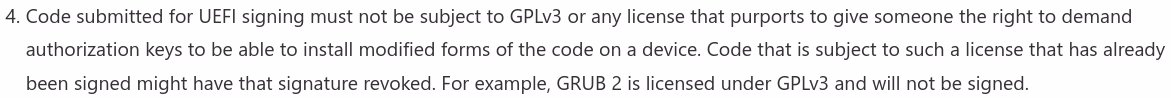 Im übrigen macht MS kein Geheimnis darum, freie Softwarelizenzen auszuschließen. Code, der beispielsweise unter GPLv3 steht (wie Grub), werden sie pauschal nicht signieren. Sollte das dennoch passiert sein, behält sich MS vor, dies zurück zu ziehen. MS behauptet, die GPLv3 würde sie zur Herausgabe der Master-Schlüssel zwingen.