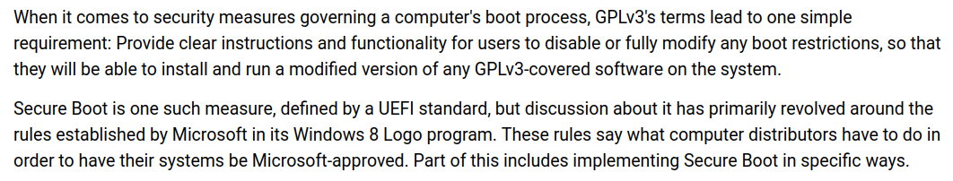 Da Secure Boot komplett in der Kontrolle des Konzerns liegt, kann er frei entscheiden, unter welchen Umständen sie andere Betriebssysteme darüber starten lassen. Selbst 12 Jahre später scheint dieses Quasi-Monopol selbst für staatliche Regulierungsorganisationen kein Problem darzustellen. So führt der Konzern 2022 die NX Kompatibilität als Voraussetzung ein. Freie Softwarelizenzen wie die GPLv3 akzeptiert er nicht. Insgesamt 18 Punkte müssen erfüllt sein, um überhaupt von MS in Erwägung gezogen zu werden. 1