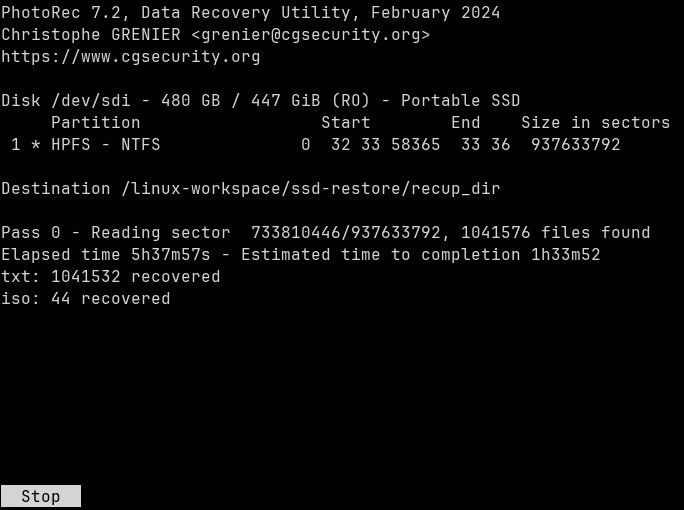 Damit ist alles vorbereitet: PhotoRec beginnt, die gewählte Partition bzw. das Laufwerk nach wiederherstellbaren Dateien zu durchsuchen. Je nach Größe und Filter kann dies einige Zeit dauern. Selbst mit nur zwei Filtern waren auf einer 500 GB großen SSD ungefähr 7 Stunden nötig. Im unteren Bereich seht ihr in Echtzeit, wie viele Dateien pro Typ bereits gerettet werden können. Generische Formate wie txt liefern sehr viele Ergebnisse, weil diese auch in Archivdateien (hier ISOs) gefunden werden.