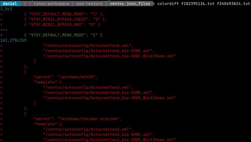 Schneller funktioniert es mit ripgrep (rg)2, weil es z.B. binäre Dateien überspringt. Unabhängig davon welches der beiden ihr einsetzt, denkt an eines: PhotoRec hat alle lesbaren Dateien auf dem Laufwerk wiederhergestellt. Darunter können sich also auch ältere Versionen befinden, die etwa gelöscht worden sind. Das war bei mir der Fall – etwa Sicherungskopien bei Tests. Ich habe daher alle Funde in einen Ordner kopiert. Anhand der Dateigröße ließen sich offensichtliche Fehltreffer aussortieren. Beim Rest schaffte colordiff durch Zeilenweise vergleichen Klarheit. Im folgenden Beispiel ist die erste Datei aktueller als die Zweite.
