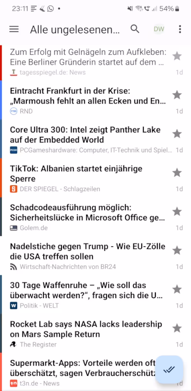 Für Mobilgeräte existieren Apps. Als ich beruflich noch ein iPhone nutzen musste, habe ich die dortige App getestet. Beim Laden war es langsam, abgesehen davon brauchbar. Mittlerweile verwende ich News ausschließlich auf Android, dort läuft es am besten. Durch die Titel vom RSS-Feed zu scrollen, ist eine der wenigen Anwendungen, die auf dem Smartphone besser funktionieren, als auf vollwertigen PCs. Dazu ist es äußerst praktisch, ihn jederzeit aufrufen zu können: Auf dem Sofa, während Bahnfahrten, in Pausen, bei Wartezeiten usw. Ich lese meinen RSS-Feed nahezu ausschließlich auf dem Handy.