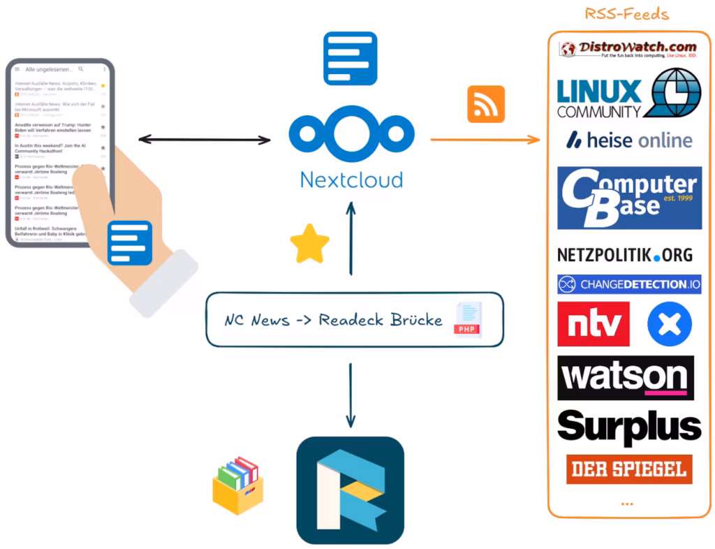 Wie sich herausstellte, ist eine komplett eigenständige Anwendung gar nicht nötig: Mit der News-Erweiterung wird Nextcloud zum vollwertigen RSS-Client.3 Das bot sich an, da ich bereits damals seit vielen Jahren Nextcloud einsetzte. Außerdem steht es jedem NC-Benutzer zur Verfügung. Darin integriert sich die Erweiterung und fügt den Reiter „News“ hinzu. Die RSS-Feeds lassen sich beim Hinzufügen in Kategorien sortieren, welche als Ordner links am Rand sichtbar sind. Ich nutze das kaum, sondern fast immer die gebündelte „Ungelesene Artikel“ Ansicht. Wichtige/Interessante Einträge lassen sich mit Stern markieren, darauf kann ebenfalls gefiltert werden. Bei mir sind sie leer, weil ich diese automatisiert in ein anderes System übertrage (s.u.).