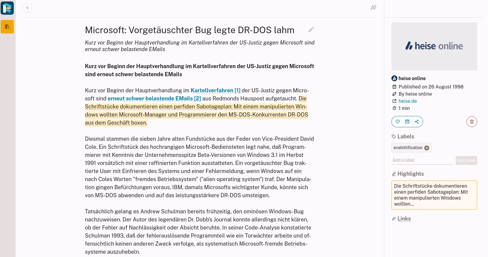 Bei mehreren tausend Einträgen pro Tag im RSS-Feed sammeln sich schnell hunderte gesternte Artikel, in denen man nur mit viel händischem Aufwand etwas findet. Ich suchte daher nach einer Lösung, sie möglichst umfangreich durchsuchbar zu archivieren. Dabei konnte Readeck am meisten überzeugen: Die ebenfalls quelloffene Software bietet umfangreiche Möglichkeiten wie Schlagworte, Sammlungen, Favoriten, Archivierung, Filterung nach Inhaltsart & mehr. Es lassen sich sogar Passagen im Artikel markieren, ab V0.22 mit Anmerkungen. Außerdem versucht sie, die Inhalte herunterzuladen – was meistens gelingt. Somit bin ich unabhängig von Änderungen oder gar kompletten Löschungen.