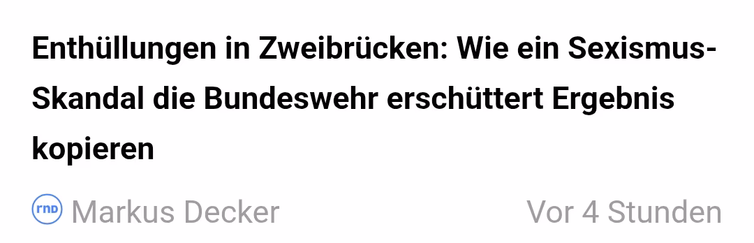 Hier erschüttert nicht nur der Sexismus-Skandal in der Bundeswehr. Sondern zunächst die Tatsache, dass der Redakteur offensichtlich den Titel irgendwo her kopiert hat. Und dabei versehentlich einen Kopier-Knopf mit markierte. Vor der Veröffentlichung ist das niemandem aufgefallen.