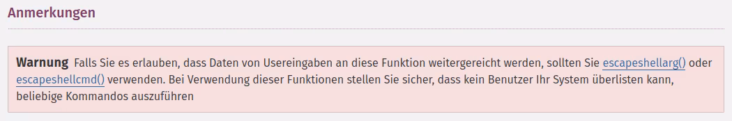 hingewiesen, womit sich für die Shell gefährliche Zeichen entschärfen lassen. Die Funktion ist für den gesamten Befehl vorgesehen. Um einzelne Parameter zu maskieren, ist escapeshellarg