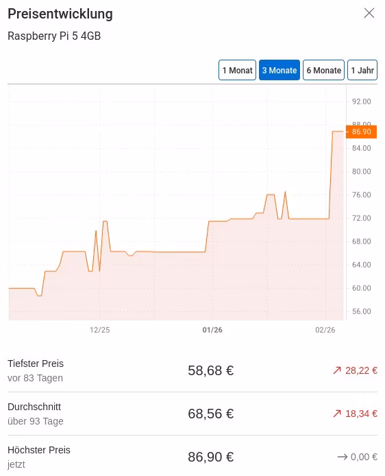Zwar ist die zweite Erhöhung sehr neu, doch die Shops haben pünktlich reagiert. Zum 02. Februar 2026 stieg etwa die 4 GB Edition des aktuellen Raspberry Pi 5 von 71,90€ auf 86,90€ an. Bereits der vorherige Preis war kein Schnäppchen. Mitte November konnte man ihn für rund 60€ kaufen.6