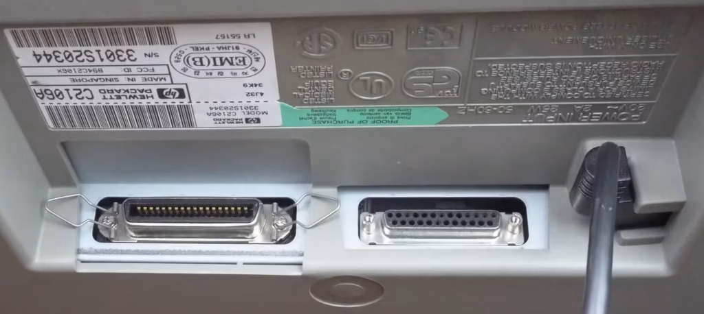 Bereits seit vielen Jahren ist USB der Standard bei privaten Druckern. WLAN ist dazu gekommen, die etwas teureren Modelle haben zudem eine JR-45 Netzwerkbuchse. Vor 35 Jahren sah das noch anders aus – Netzwerkdrucker gibt es erst seit 1996. Der HP DeskJet 500 verwendet die 36-polige „Centronics“-Buchse.4 Sie wurde in IEEE 1284 standardisiert, viele kennen sie als Parallele Schnittstelle. Das Kabel steckt man in eine 25-Polige D-Sub Buchse (bekannt als LTP-Port für Line Printer Terminal) am Computer.