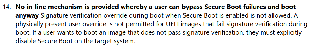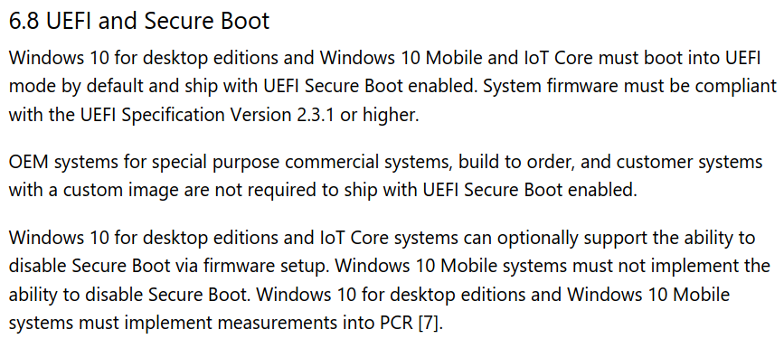 Das kam nicht überraschend, sondern folgt einem großen Plan. Bereits ab 2012 verpflichtete Microsoft die Hersteller, Windows 8 PCs mit Secure Boot auszustatten. Zeitgleich wurde ihnen verboten, einen Mechanismus zur Umgehung einzubauen. Unbekannte oder zurückgezogene Bootloader muss das UEFI ablehnen. Dies steht in den umfangreichen Anforderungen, die der Konzern an PC-Hersteller stellt – ein insgesamt 254 Seitiges Dokument.6