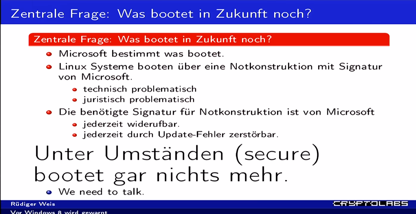 In der Bewegung freier, offener Software blieb dies nicht lange unentdeckt. 2014 widmet sich ein CCC-Vortrag dem Thema.7 Es eskalierte soweit, bis sogar das BSI wegen Kontrollverlust vor Windows 8 warnte. Der Konzern sah sein Geschäftsmodell bedroht und klagte dagegen.